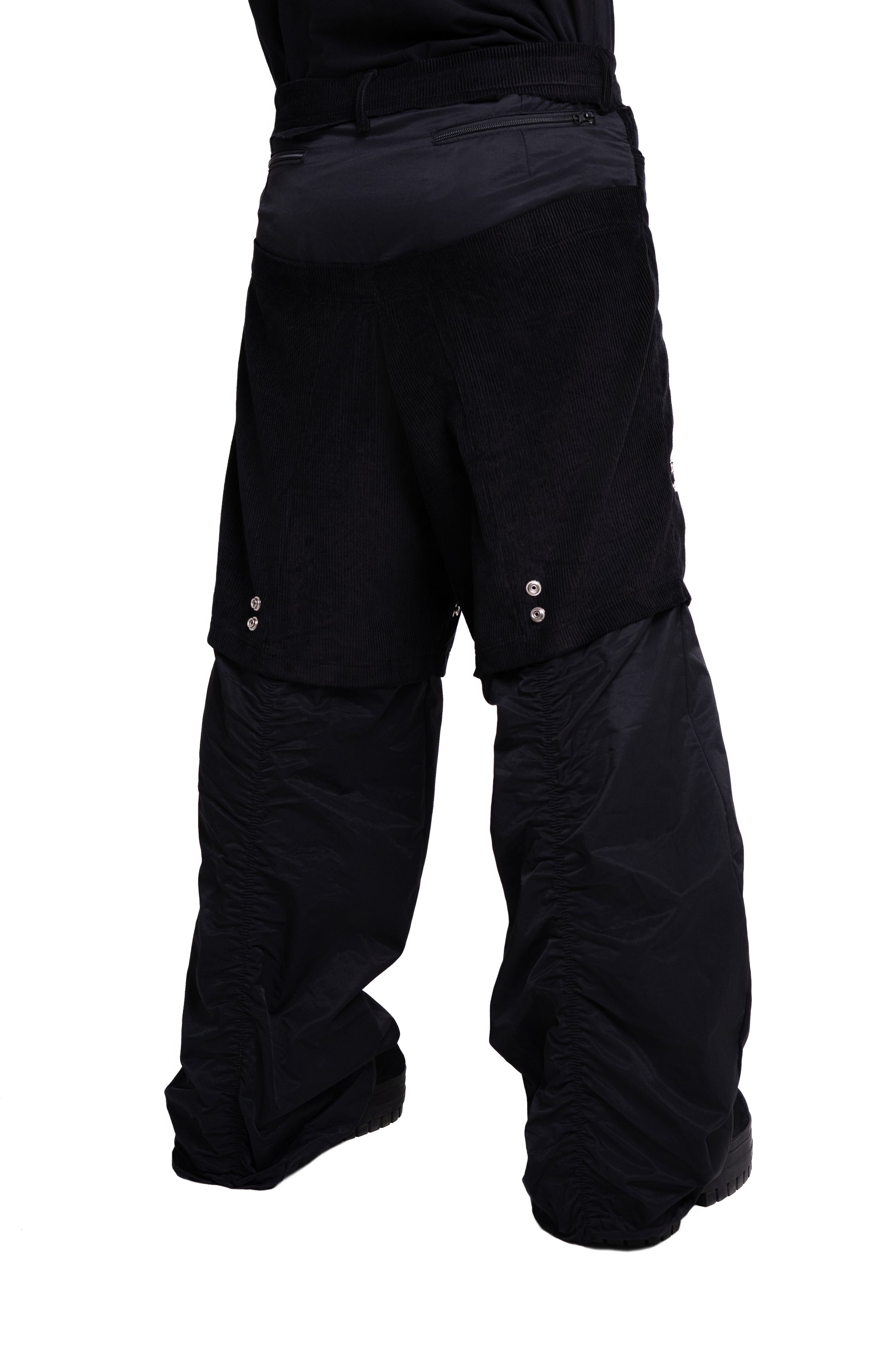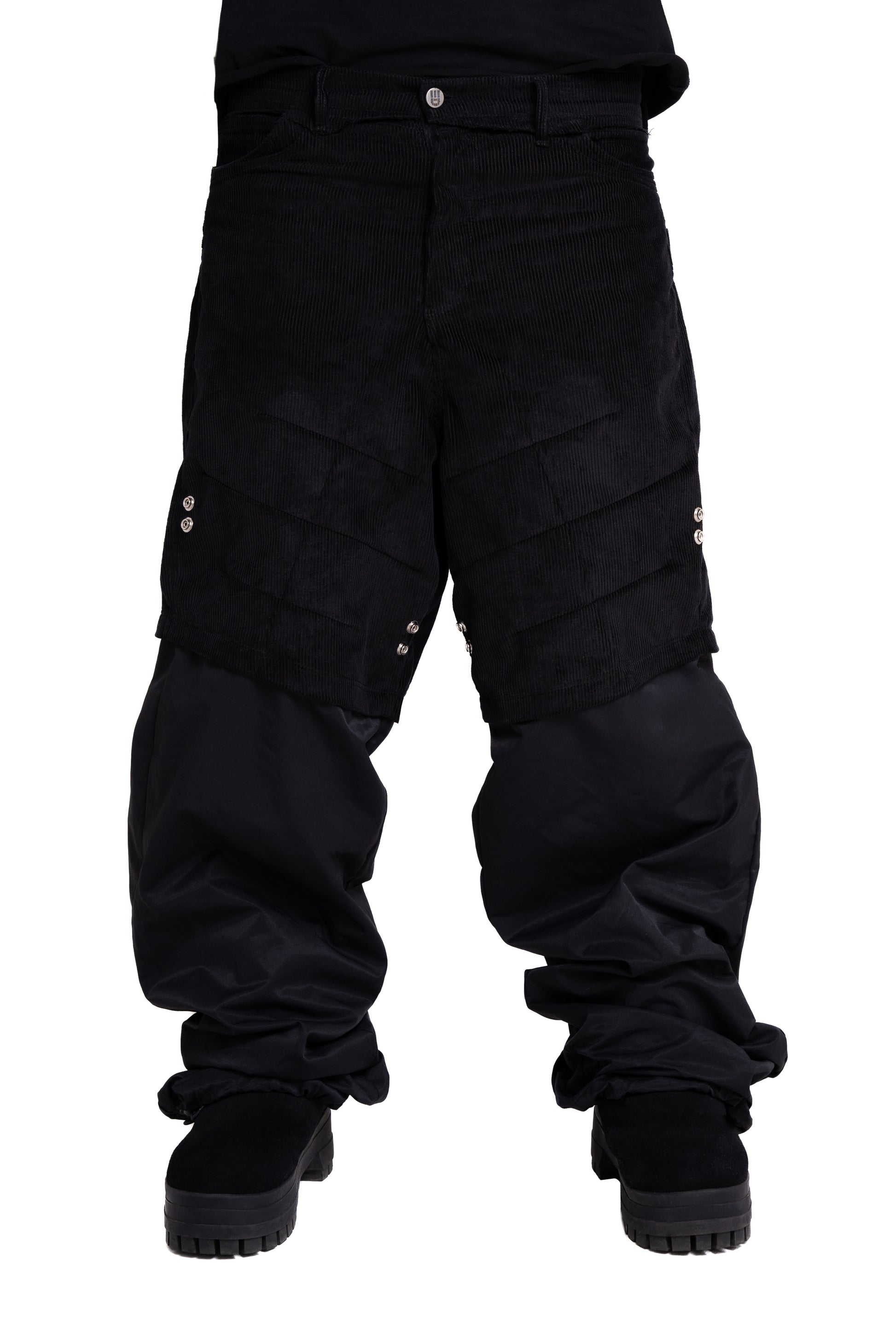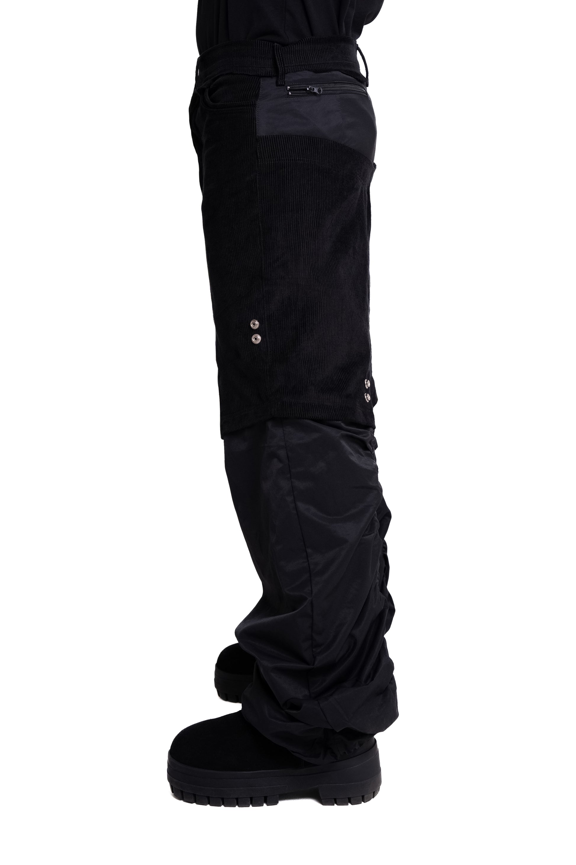 Corduroy pants made of natural cotton with nylon bottoms that can be transformed into shorts using specially designed fasteners.